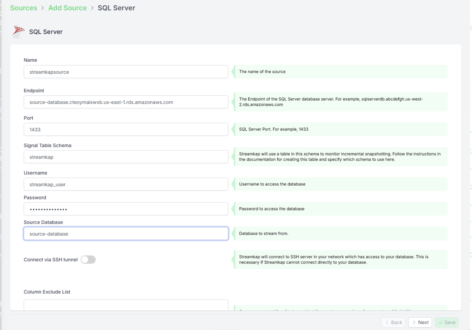 • SQL Server 서버 주소, 포트, 사용자 이름, 비밀번호. Streamkap이 SQL Server 데이터베이스에 접근할 수 있도록 별도의 사용자와 역할을 생성하는 것을 권장합니다. 구성 방법은 문서를 참고하십시오.